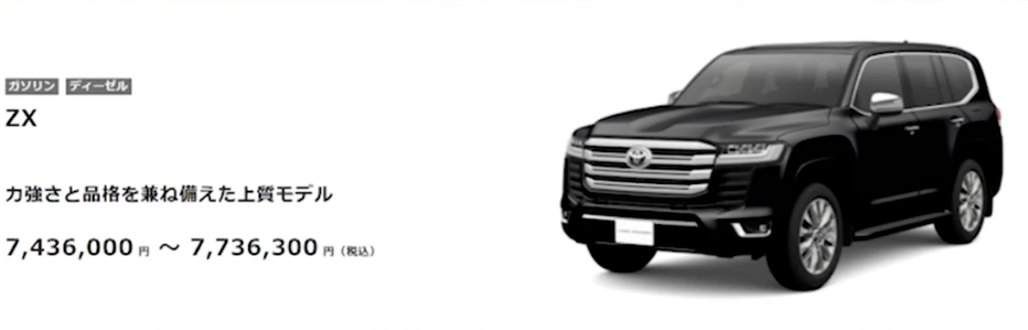 新車であれば、ランドクルーザーの最上位グレード「ZX」などが候補に挙げられます。