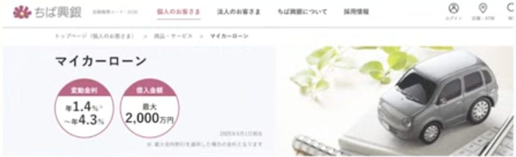 千葉銀行は地銀の中でも実績と収益が高く、地域からの信頼も厚い金融機関です。環境配慮車(電気自動車・燃料電池車・水素自動車など)の新車購入で利用可能なローンで、千葉県に加え東京・茨城・埼玉・神奈川在住の方も申し込み可能です。WEB完結に対応しており、手間なく手続きを進められます。