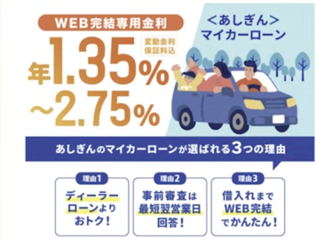千葉銀行と同じ最安金利ですが、上限金利が2.8%のため第1位に選ばれました。営業エリアは神奈川県全域と東京・群馬の一部で利用可能です。全国対応ではありませんが、利用可能エリアの方にとっては最もお得なマイカーローンと言えます。